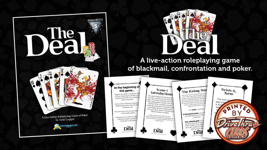 The Deal is a 4-player “poker larp” where players take on the role of fictional characters during a game of poker. Special cards are inserted into the poker deck to create plot twists that will keep everyone on their toes as their characters struggle to not only win the game… but win back their lives.